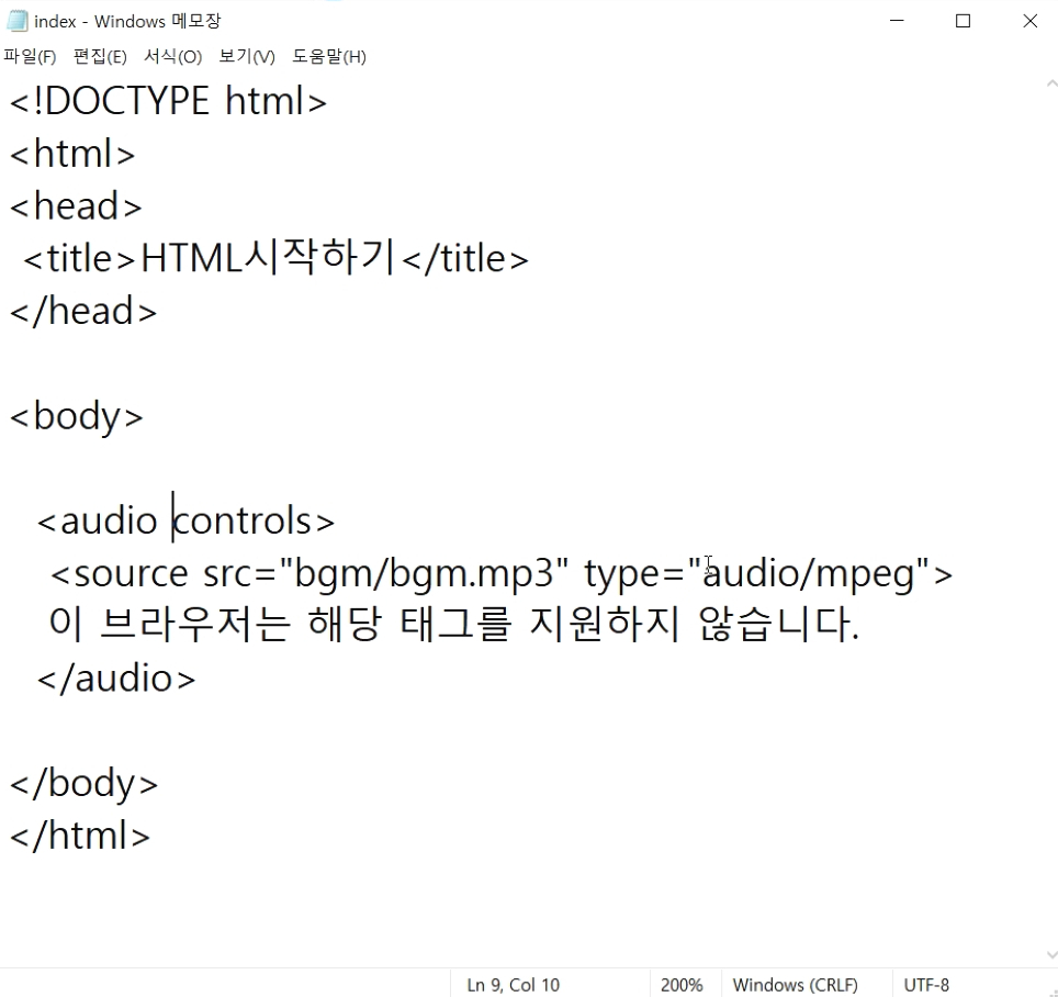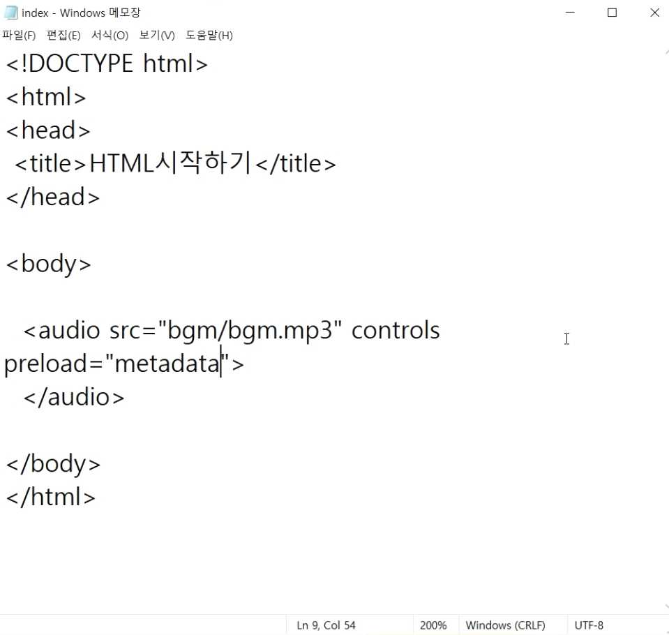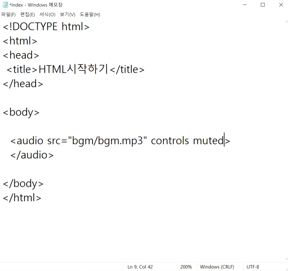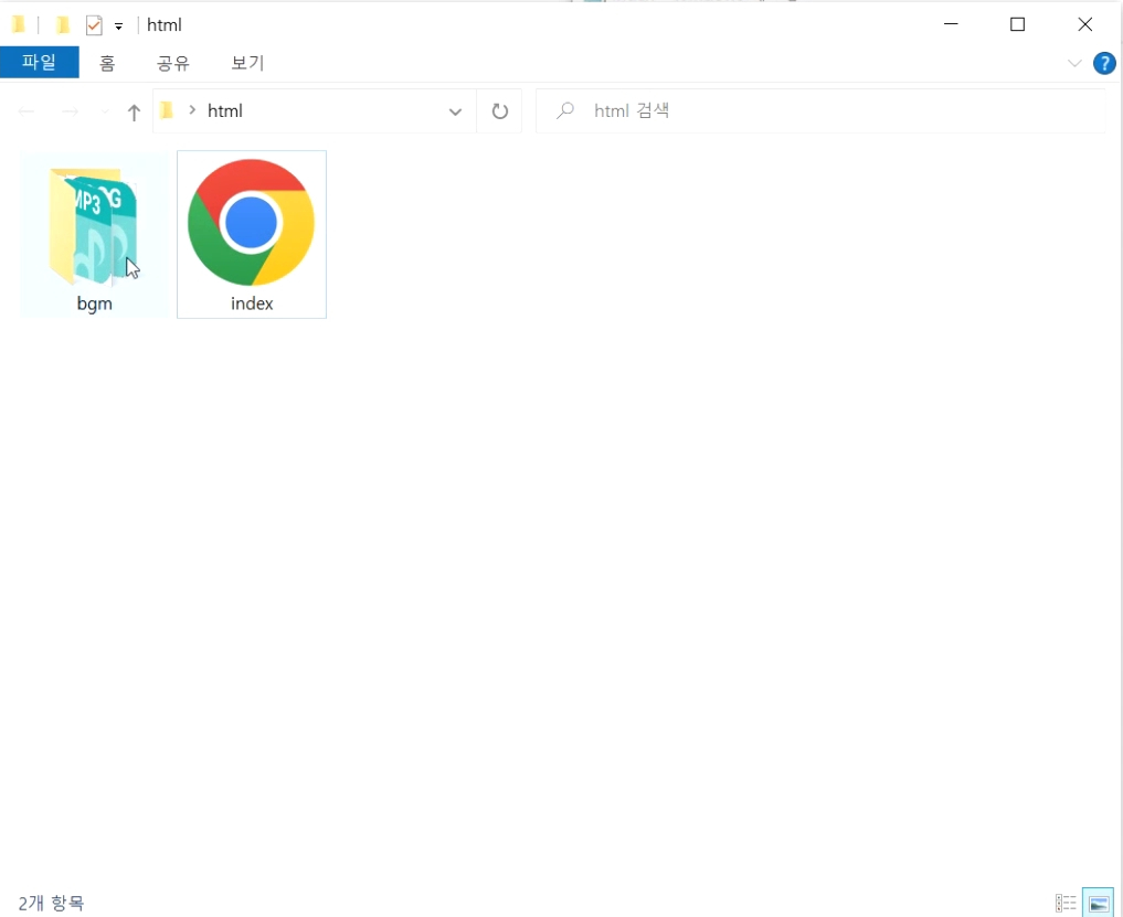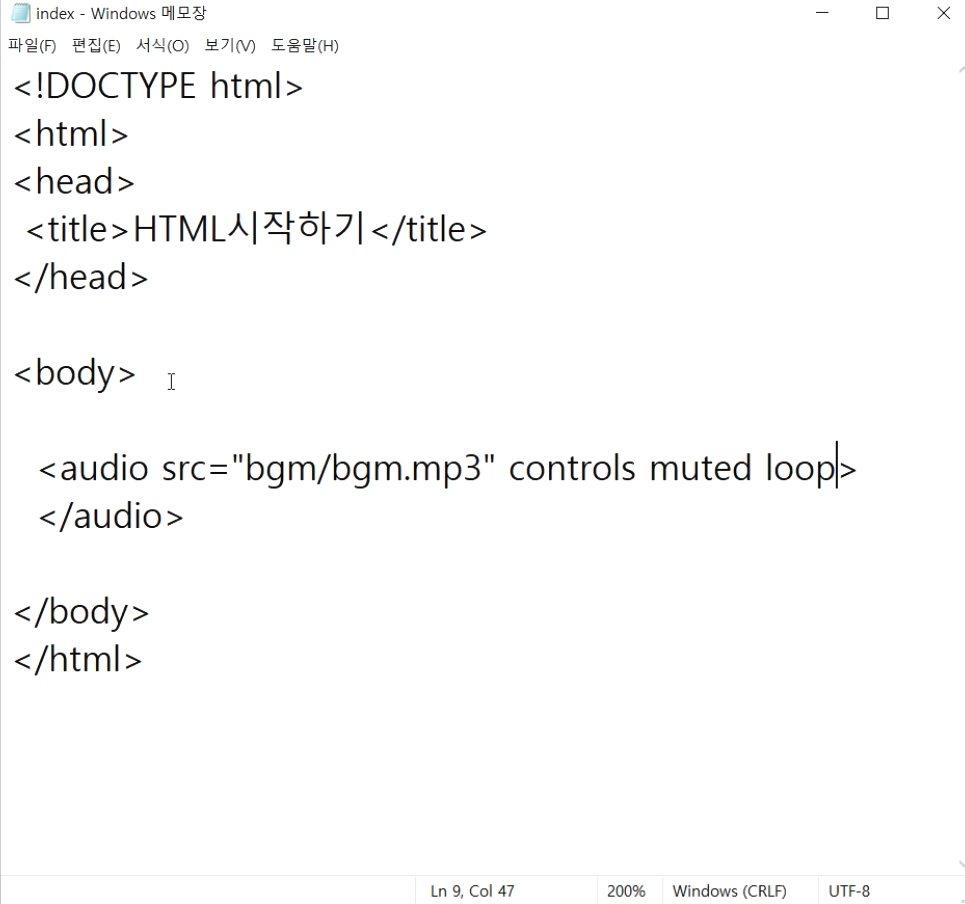 index.html 파일에 우선 bgm 폴더의 bgm.mp3 파일을 불러오는 audio 태그를 작성하고 확인하겠습니다.